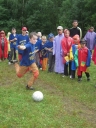 deště hráli kopanou proti menším chlapcům. Na druhé straně hřiště stály ženy